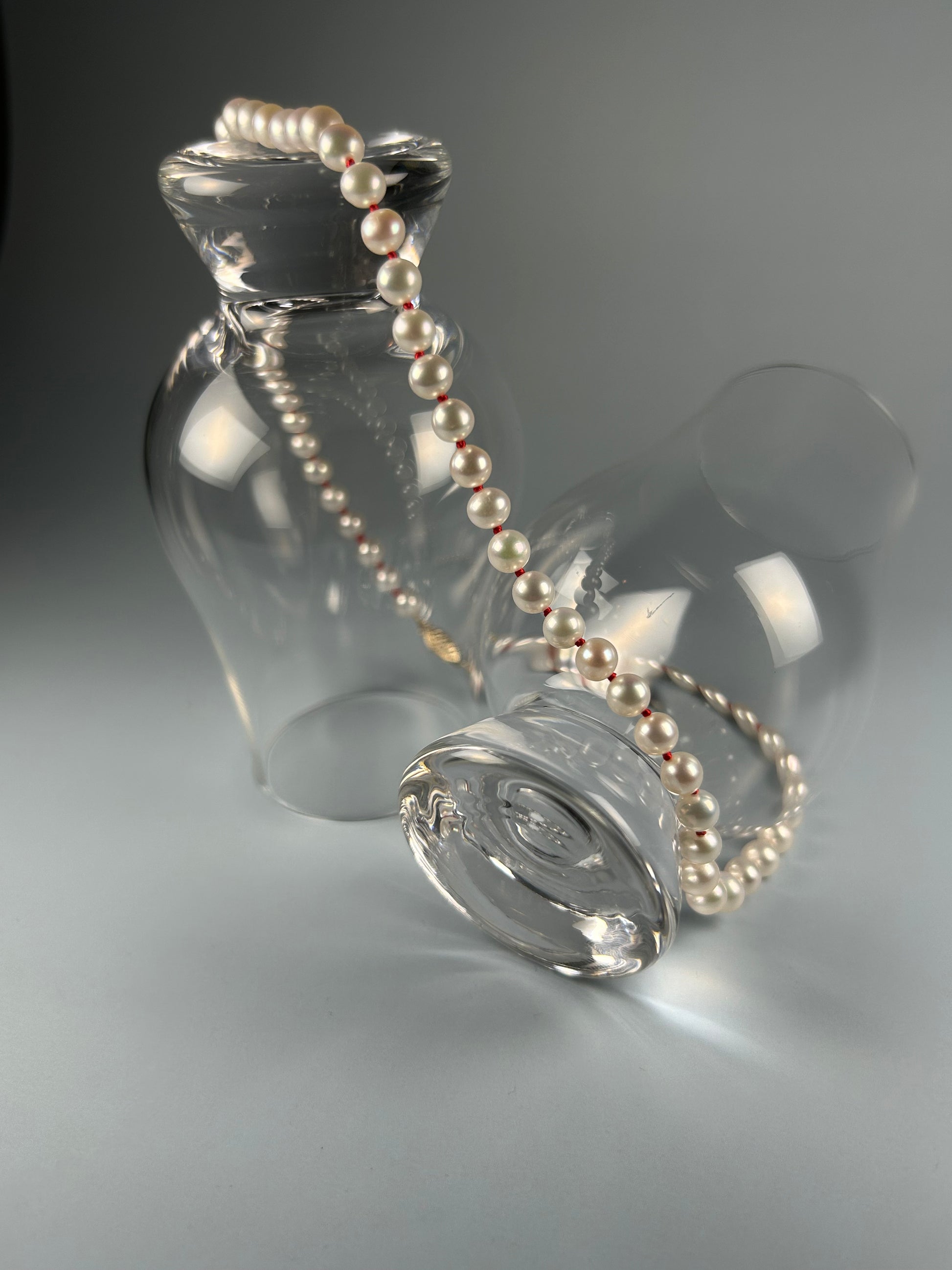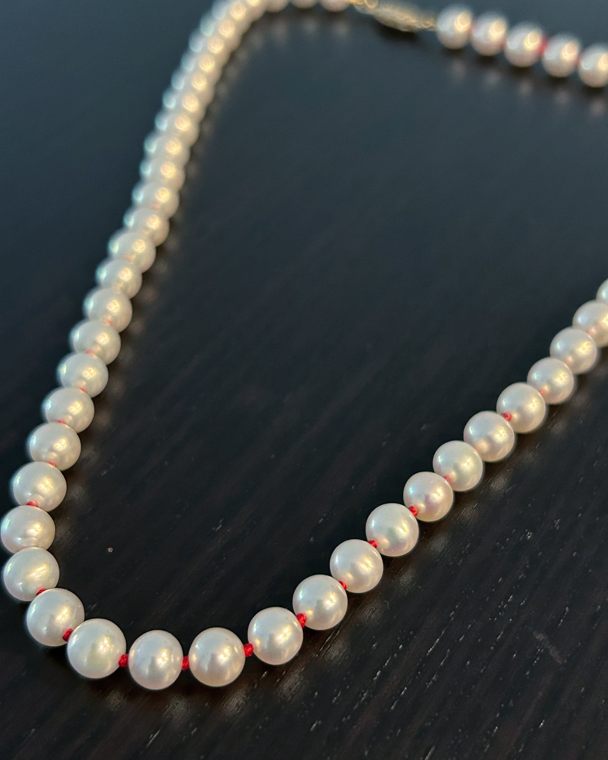 This elegant 16.5-inch necklace features nearly perfectly round, 6.5mm mirror-like saltwater pearls, hand-knotted on vibrant red silk, symbolizing the unbreakable bond of destiny. Part of the exclusive Red String of Fate series, the striking contrast between the luminous pearls and the bold red thread evokes timeless elegance and connection. Secured with a 14K gold clasp, this piece blends luxury with meaning, making it a perfect expression of enduring love.